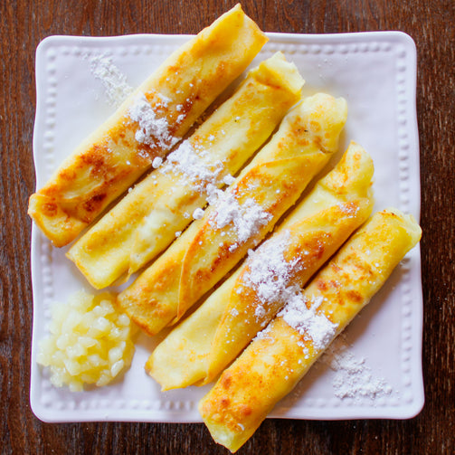 These blintzes are made with thin dough filled with a sweet apple filling. Full tray has 40 pieces, half tray 20.