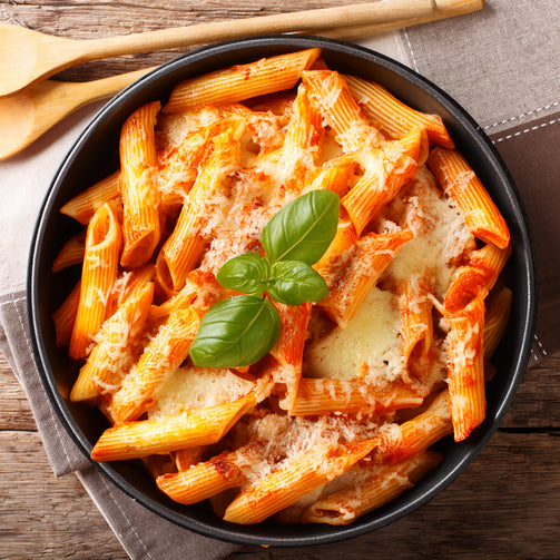 Fresh Italian pasta mixed in rich meatless tomato sauce smothered with melted mozzarella cheese. Perfect for kids!