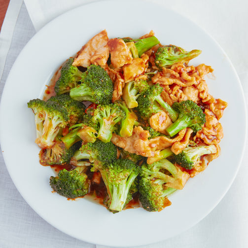 Strips of pan-seared chicken breast tossed with fresh broccoli and str-fried in a soy sauce.