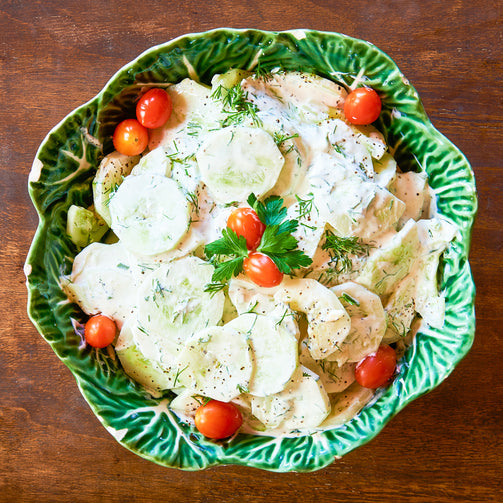A simple old-world classic consisting of peeled cucumbers in a sour cream dressing garnished with spices and dill.