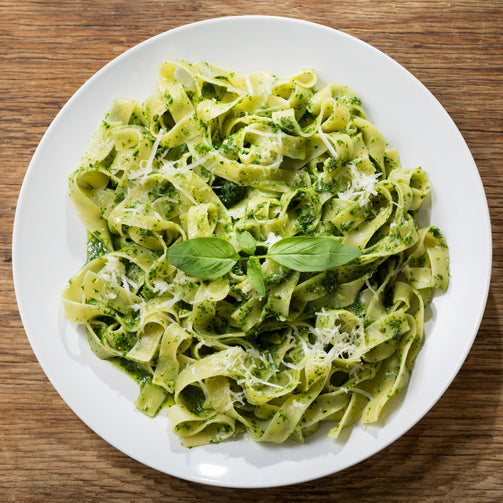 Thick fettucine pasta mixed with decadent butter, garlic, sautéed baby spinach, and spices.