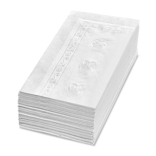 These 2-ply white embossed dinner napkins are soft and absorbent, with a linen look. Pack contains 150 napkins.