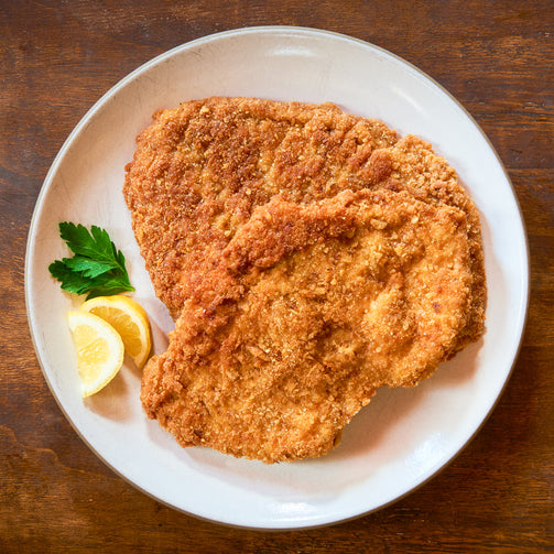 Boneless center-cut pork chops, butcher-cut, pounded thin, dredged in flour, egg, and breadcrumbs and fried quickly to a golden brown. Full tray has 20 regular cutlets, half tray has 10. Also available in half-size mini cutlets. Full tray has 40 mini cutlets, half tray has 20.