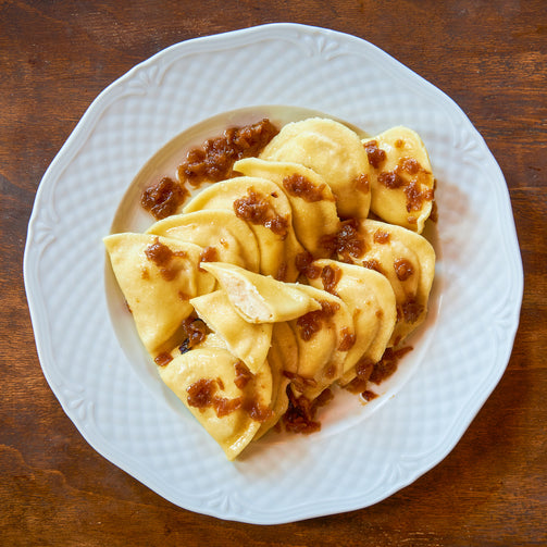 These famous homemade Polish pierogi are stuffed with potatoes, Farmers Cheese, sautéed onions, and spices. Served hot covered with caramelized onions. Full tray is 10 dozen, half tray is 5.