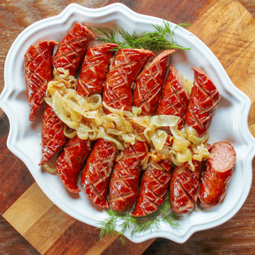 Thick cuts of our famous homemade smoked kielbasa, roasted and smothered in caramelized onions.