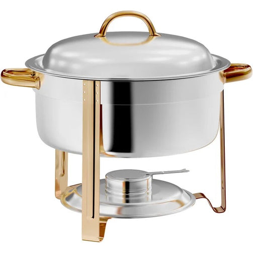 The perfect way to serve soup hot and fresh for your guests. Elegant stainless steel with polished mirror finish and gold trim. Holds 8qt of soup, heated by a standard sterno burner so it can be placed anywhere. Includes ladle. Must be returned the day after your event.
