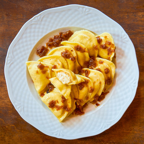 These famous homemade Polish pierogi are stuffed with potatoes, Farmers Cheese, sautéed onions, and spices. Served hot covered with caramelized onions. Full tray is 10 dozen, half tray is 5.