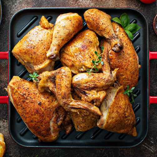 Fresh chicken quarters, drumsticks, and wings marinated in our secret spices, then slowly roasted until glistening and golden.