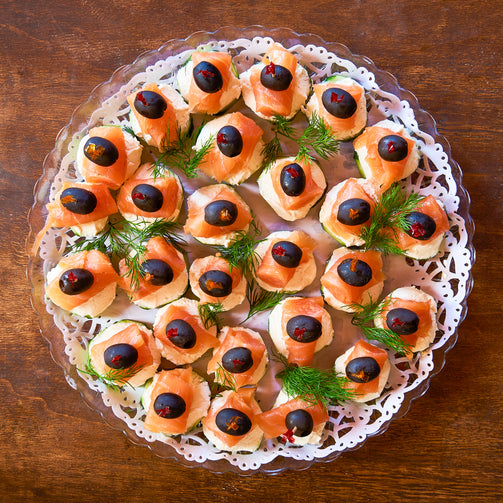 A platter with generous slices of our famous homemade smoked salmon, garnished with cream cheese, vegetables, herbs, and zesty lemon.